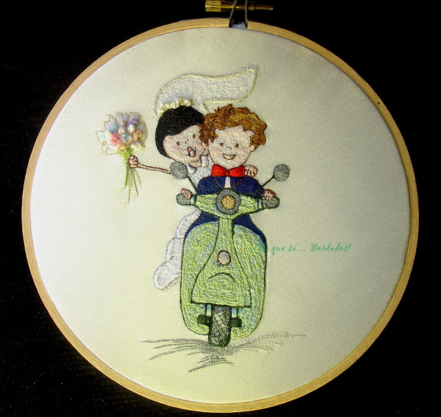 BASTIDOR BORDADO COMO PORTA ALIANZAS. "Novios a la fuga "